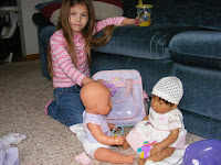 Max woke up at around 8:30 and crawled in bed with us. He didn't even notice all the presents under the tree. Bruce and I were really tired cause we were up till 3:30 last night. We were glad Max wanted to just stay and cuddle. Hailey woke up at about 9:30, and then we all got up. The kids were excited to walk out to the living room and see all the gifts under the tree. They loved looking at all the name tags to see which ones were for them. After checking out all the presents under the tree, they just went to playing with the toys that they got at the Christmas parties. Max lined up his new cars and Hailey lined up her new dolls (the three she got for Christmas and birthday and one that she got last year). I don't think she can ever have enough dolls. She is just like I was when I was little. They played for awhile, and then I told them they could open their stockings while they waited for Nana to show up. They were so excited about the little things they got in their stockings. They played with those until Nana came. Then we had Bruce's cinnamon rolls before opening gifts. Papa had to work but he stopped over for a few minutes for cinnamon rolls too. Jack enjoyed eating a teething biscuit that he got in his stocking. It was the first time he's had anything besides baby food, and he really liked it. The kids wanted to give their gifts they got for each other first. Hailey handed Max his and said "Here open this Max, but it's not a car." (Since this morning as he was pointing to the different presents under the tree, he kept saying "Dis is for me. Dere's a car in dere.") When he heard Hailey say it wasn't a car, he put it down and said "I don't want to open dis, Mommy. Haywee said it's not a car." I was able to easily talk him into still opening it though. He was so excited when he saw it was a drum. He wanted to get it out of the box right away. Hailey smiled as she watched him get all excited about it. He played it as he marched around the room. Next, Hailey wanted to give us the presents that her and Max got us. Hailey was so excited for daddy to open his tuba ornament from her. She saw it in a store and just had to get it for daddy. It was so cute how she thought of him right away when she saw it. She said "Oh, a tuba! We gotta get this for daddy. He will love it! " When he opened it she said "It's a tuba! You hang it on the tree!" The kids were excited to have me open the charms they picked out for my bracelet. The kids opened some gifts from us, and Bruce and I gave our gifts to each other. I was so happy to get a small camera that fits easily in my purse. I was very surprised too cause Bruce always tells me I don't need two cameras. The kids loved their shopping cart and pushed it around the house playing store. Max like that he can push his monkey in it. And Hailey loads it up with "groceries" and then puts one doll in the front seat and another doll in the doll carseat in the back. It's funny cause she loads it up just like we do when we got to the store. The kids sure had fun playing with all their new toys. Hailey had fun feeding her "baby that poops". She thought that was pretty funny. Then she gave her baby a bath. The rest of the day was spent just opening boxes for the kids and letting them play with their new toys. Of course, I had to play with my new camera too and took lots of pictures with it. I also worked on unpacking and laundry while the kids were playing. Bruce had to leave for work around 3:00, and I put Max and Jack down for a late nap. After dinner, the kids had more fun playing with all the new toys. I gave the kids baths before getting ready for bed. I brought Jack in the bathroom with us and sat him in his Bumbo seat with the tray on (one of his presents he got today). He seemed to like that much better since his toys didn't keep falling out of his reach. The tray helps him keep his toys longer instead of dropping to the floor right away, and it seems to help him sit up straighter too. and Max really liked playing with his trains in the tub. And Hailey really enjoyed playing with her dress-up doll stickers for the tub. She organized all the clothes into groups of shirts, pants, and shoes and said it was the store. We each took a girl "shopping" and picked out outfits for them to wear. It was alot of fun.
